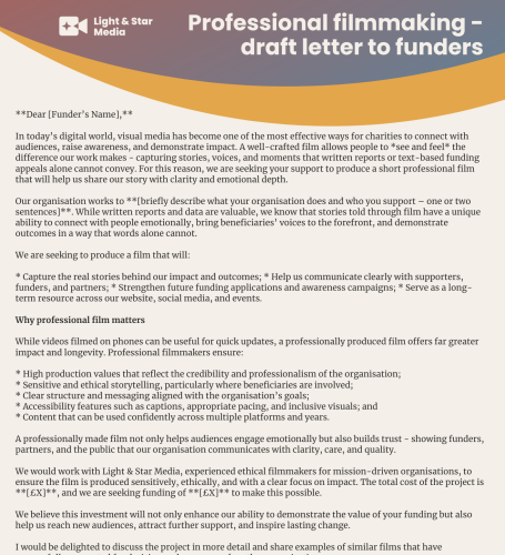 A draft letter to adapt and send to funders to attract the donations needed for professional filmmaking.